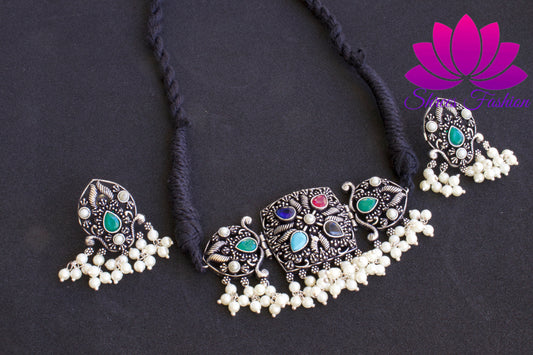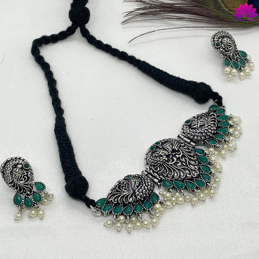 Oxidised Silver Green Stone and Pearl Choker and Earings