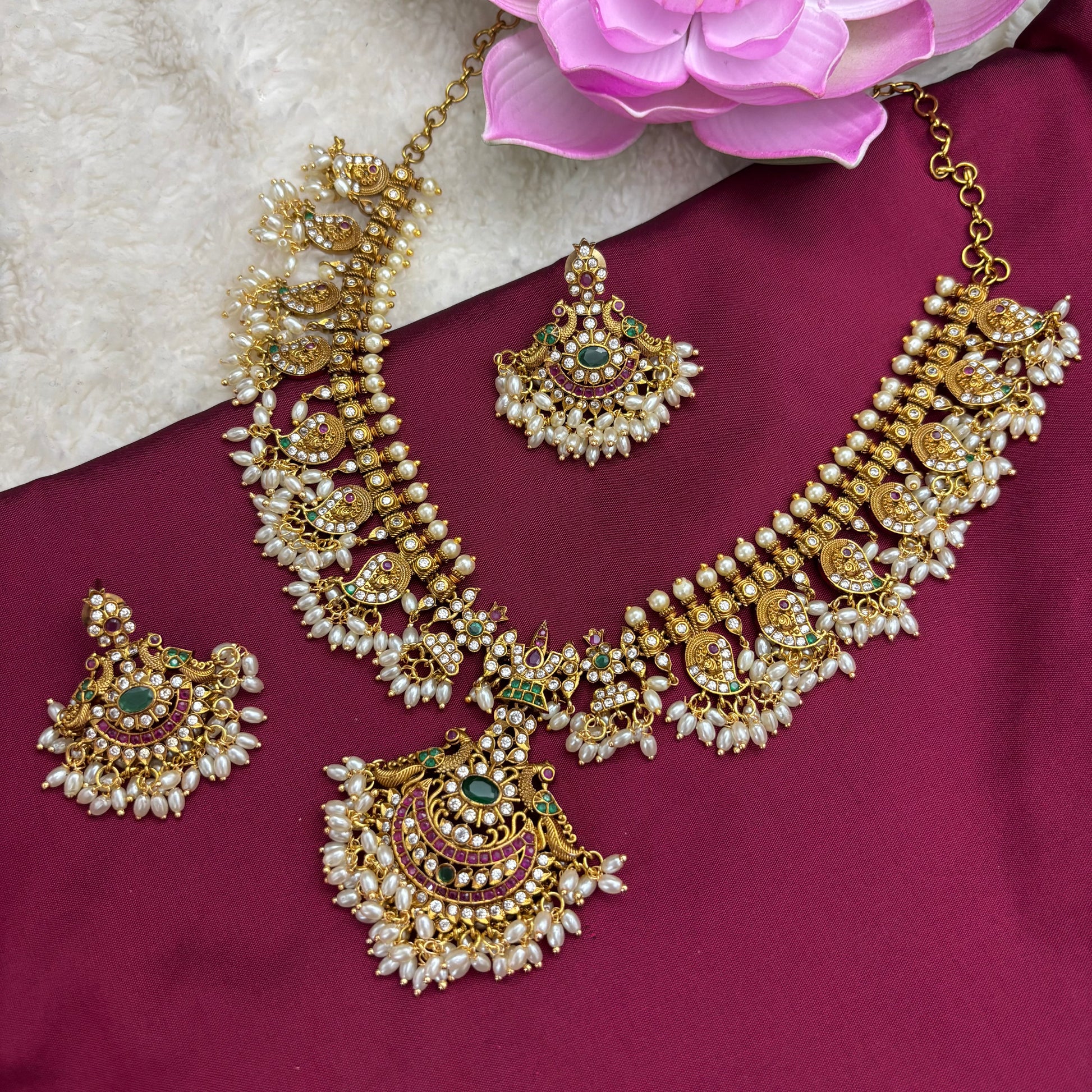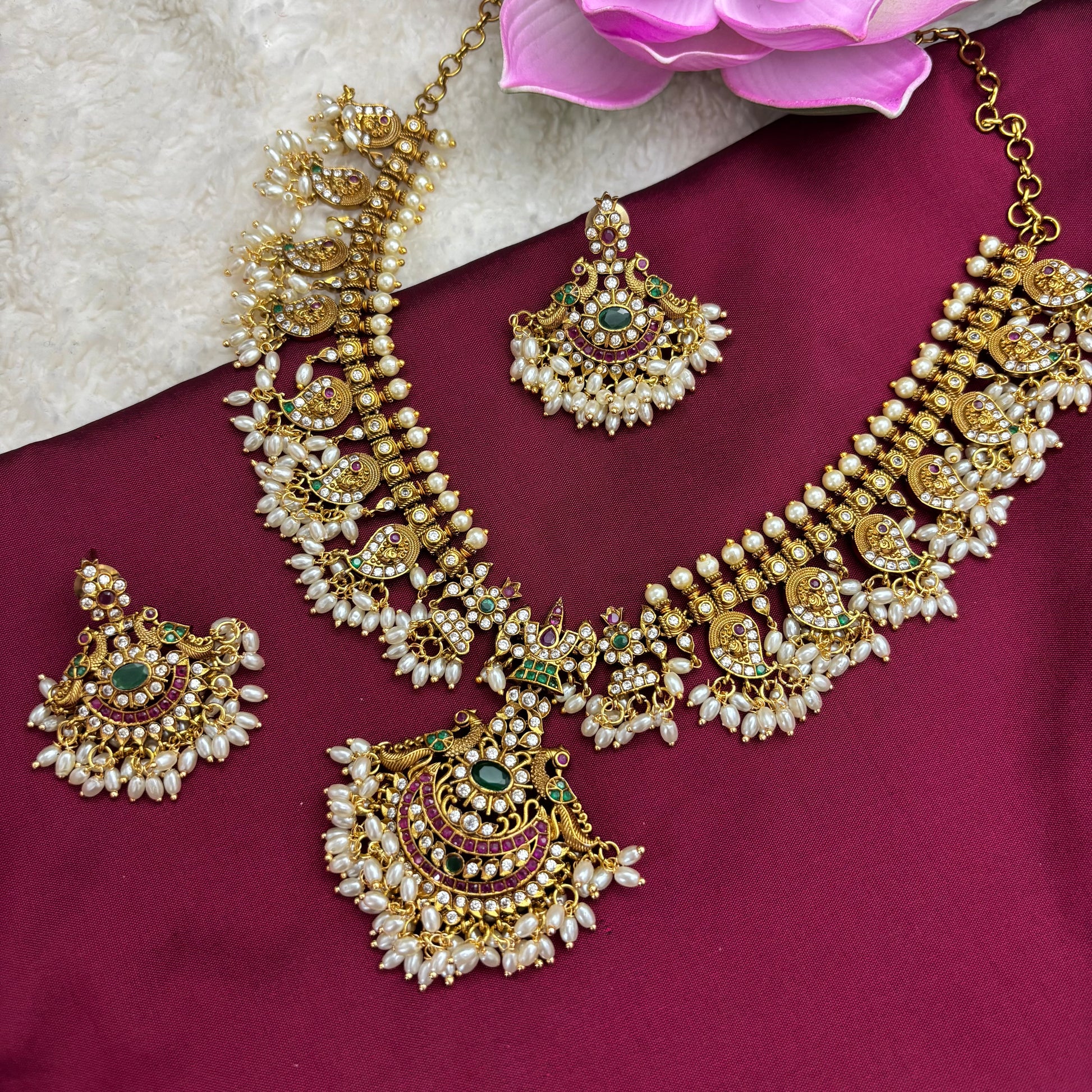 A timeless tribute to South Indian artistry, this Guttapusalu necklace is adorned with clusters of lustrous rice pearls, cascading like temple garlands. The design is enriched with vivid pink and green Kemp stones, nestled in antique gold settings that echo traditional floral and paisley motifs.