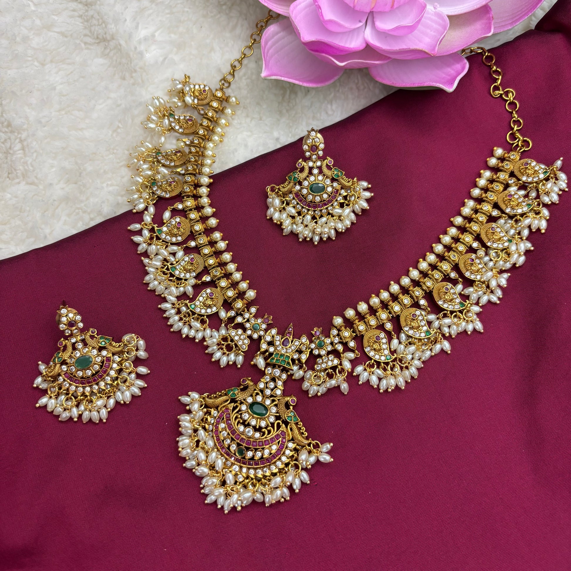 Each pearl strand dances with movement, while the colored stones add a regal vibrance—making this piece perfect for bridal wear, festive occasions, or heirloom-inspired styling. The necklace is paired with matching earrings, completing a look that’s both opulent and deeply rooted in cultural legacy.