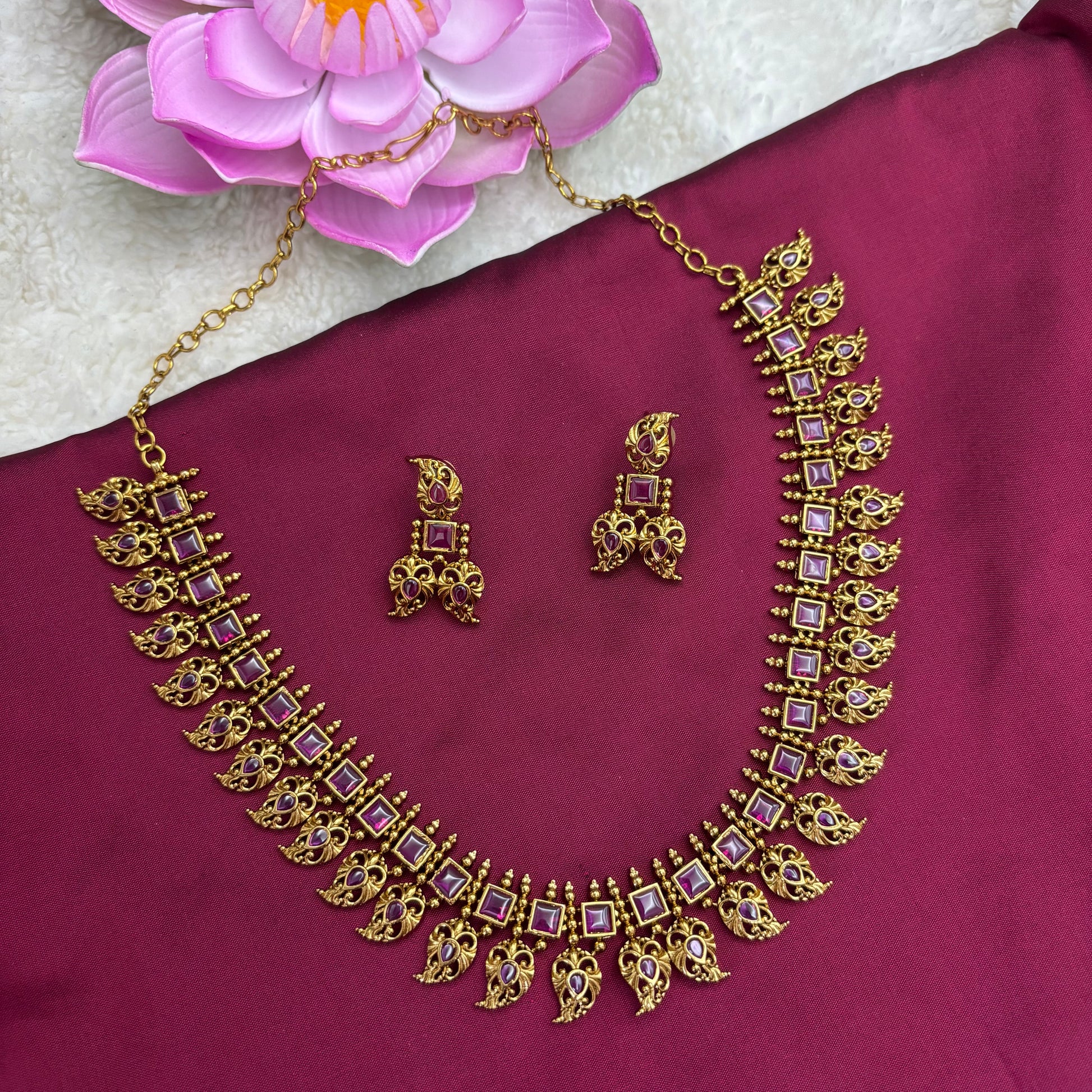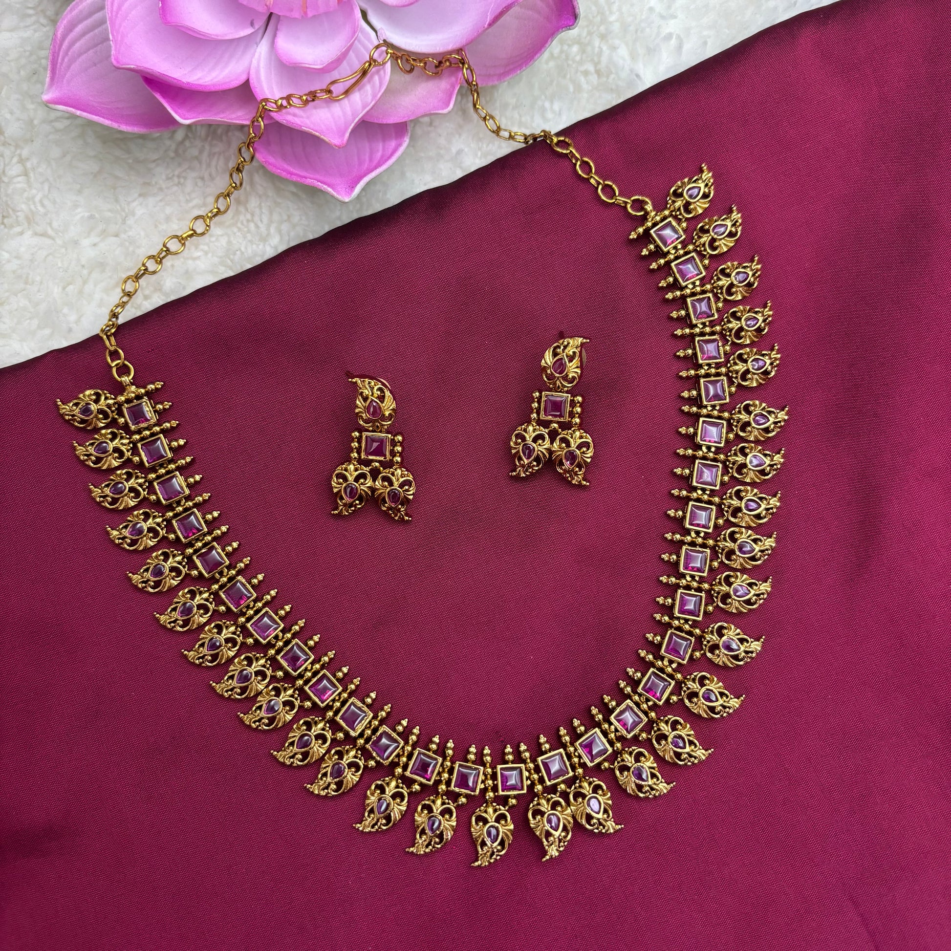 A timeless tribute to South Indian artistry, this Mango Design Necklace Set features a graceful interplay of rani pink and light green Kemp stones, set in a classic antique matte gold finish. The iconic mango motifs—symbolizing prosperity and fertility—are intricately arranged to evoke temple jewelry traditions with a fresh, feminine twist.