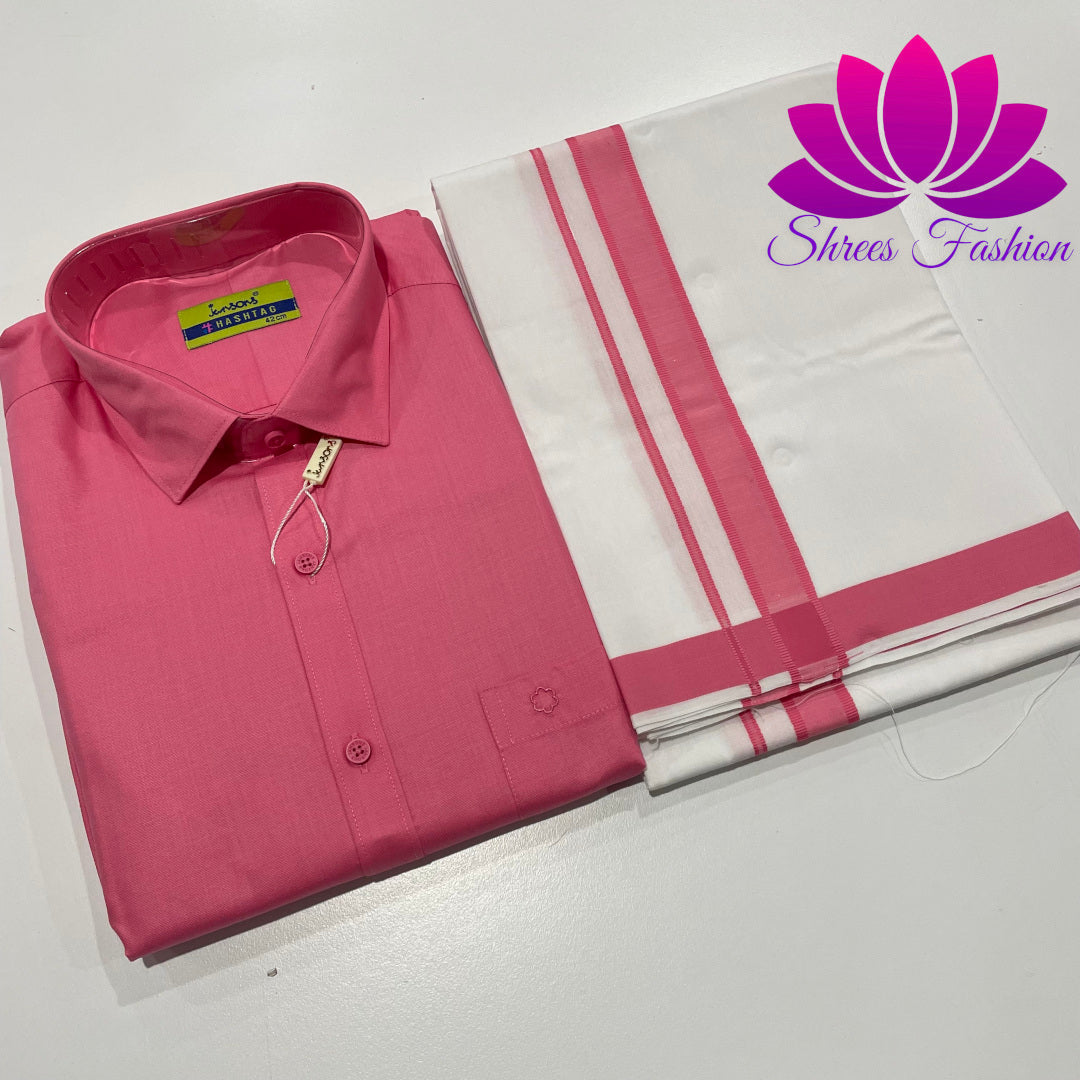 Roseate Elegance: Pink Shirt Paired with Timeless Veshti/Dhoti Ensemble