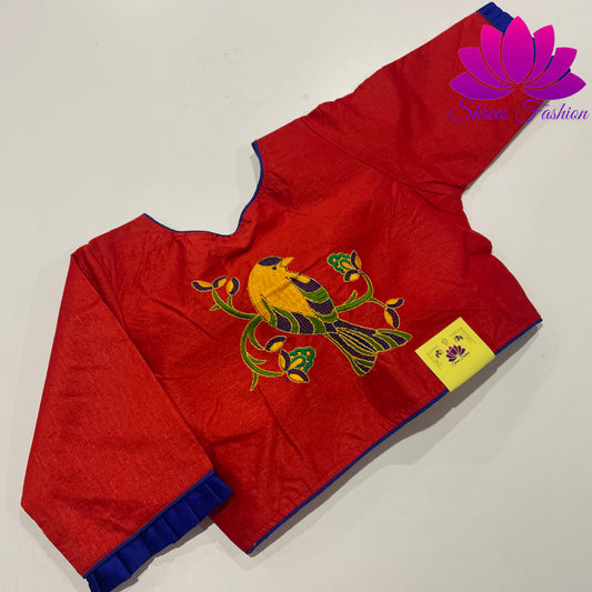 Crimson Azure: Red Blouse with Blue Piping and Back Embroidery