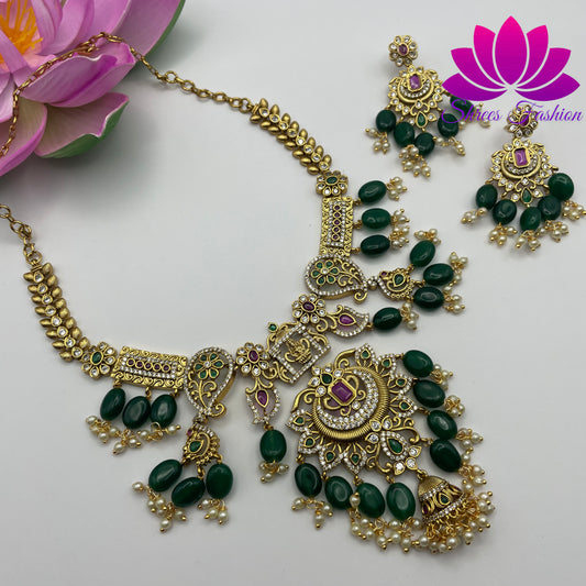 Glamorous Green Elegance: Matte Gold Finish with Cubic Zirconia Stones and Green Beads