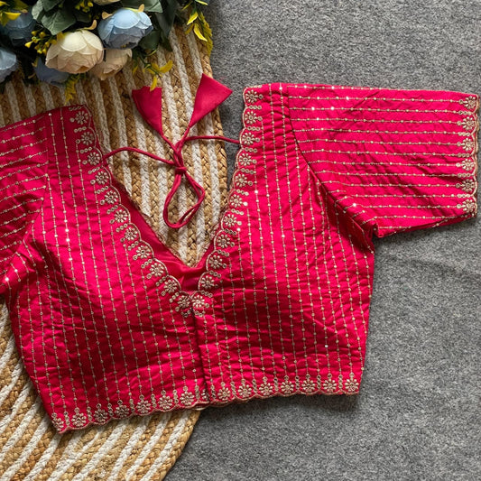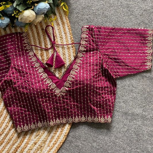 Magenta V-Neck Blouse with Intricate Golden Embroidery