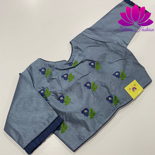 Slate Serenity: Blue Blouse with Grey Piping and Back Embroidery