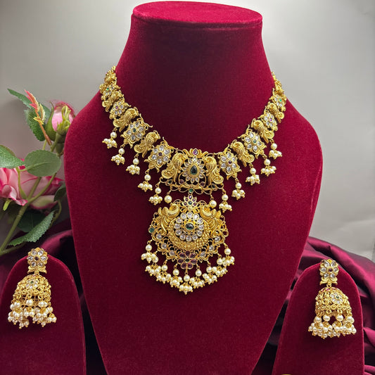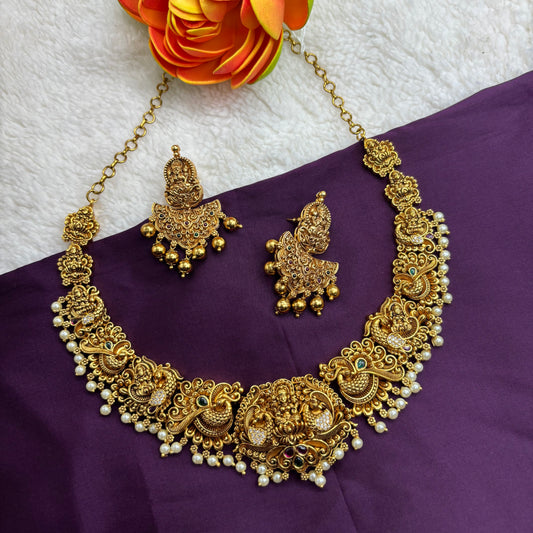 Two-Layer Temple Necklace Set with Intricate Peacock Motif – Matte Gold Finish