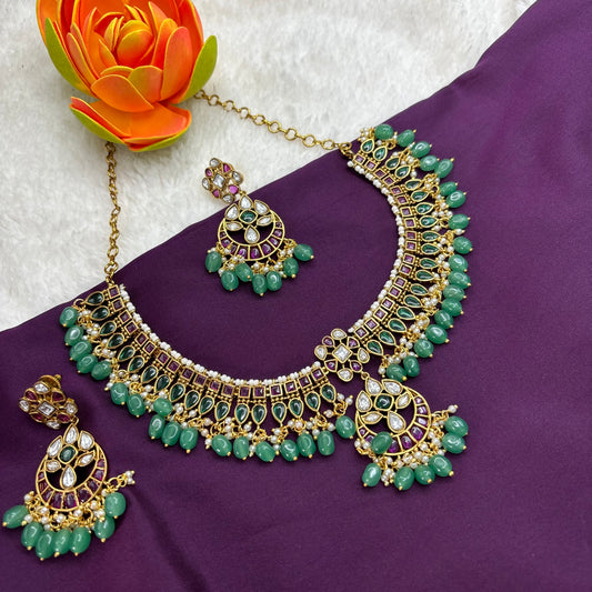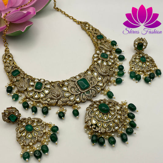 Timeless Spark – CZ & Kemp Stone Necklace Set with Jhumkas