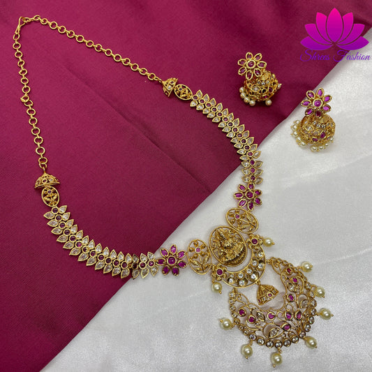 Matte Gold Finish Necklace Set with Elegant Pink Stones – Traditional South Indian Design