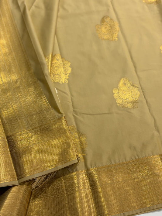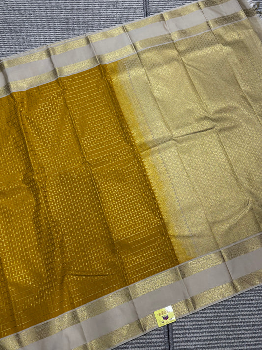 Elegant Semi Kanchipuram Saree – Mustard Body & Beige Gold Border