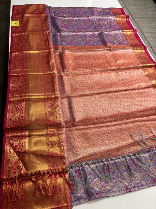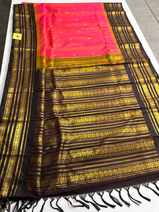 Peach & Brown Kanchipuram Semi Silk Saree with Contrast Border & Pallu