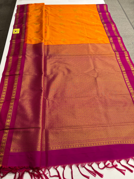 Kanchipuram Semi Silk Saree – Mango Yellow Body with Magenta Border and Pallu