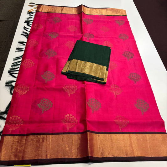 Handwoven Kanchipuram Silk Saree in Rani Pink and Bottle Green with Gold Zari Work