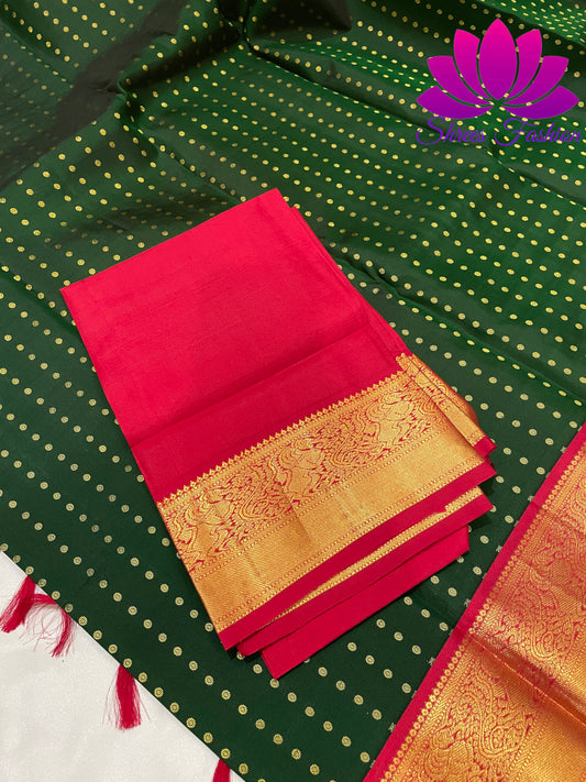 Bottle Green With Red Colour Combinations Dotted Design Kanchipuram Silk Saree