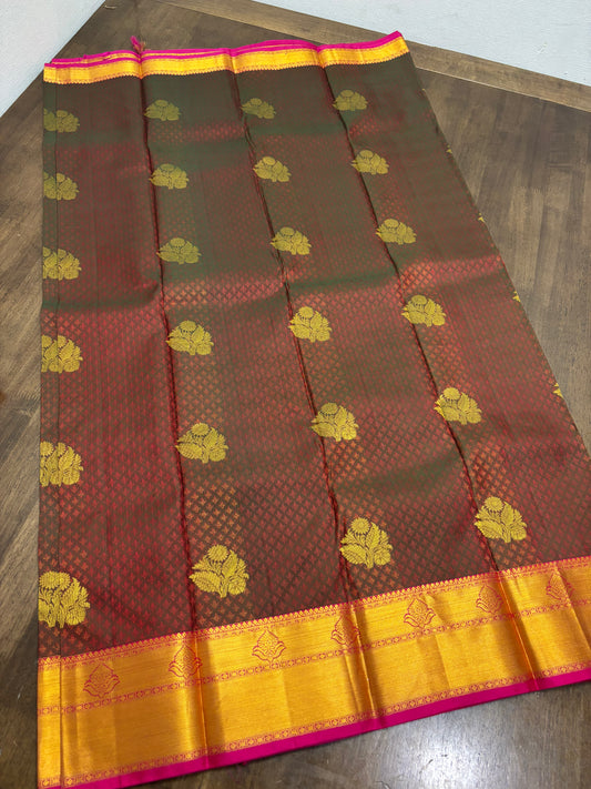 Maroon & Henna Green Dual Tone Kanchipuram Silk Saree with Pink Border & Pallu