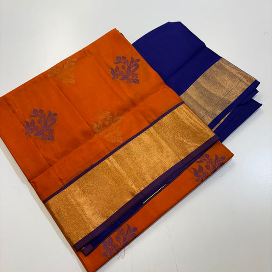 Pure Kanchipuram Silk Saree – Burnt Orange with Vibrant Blue Contrast