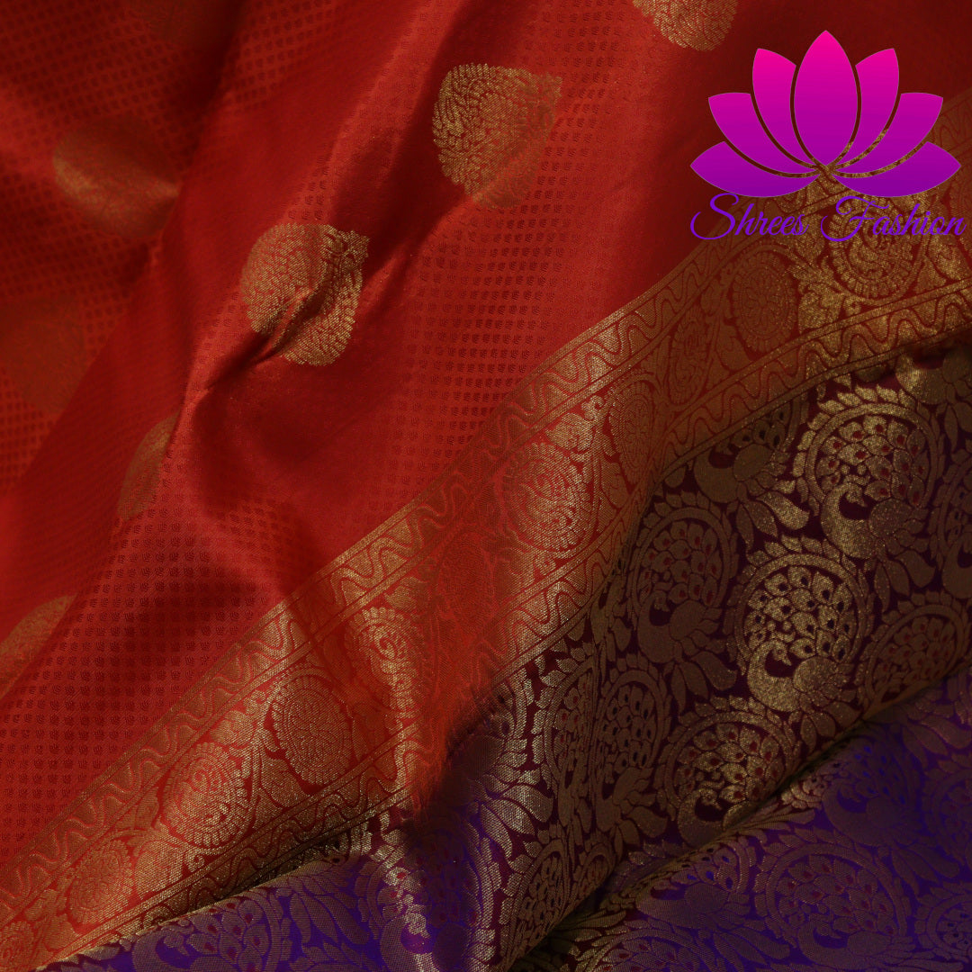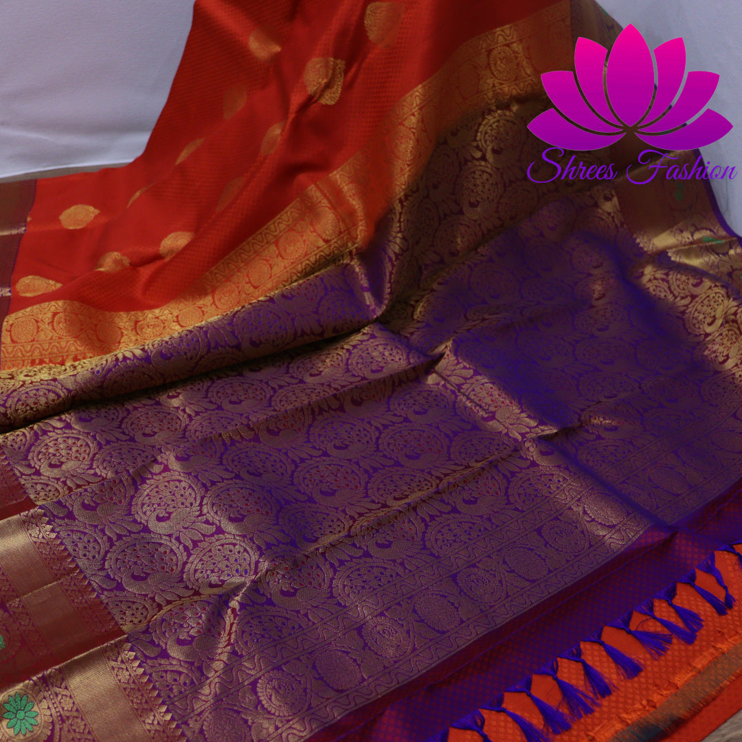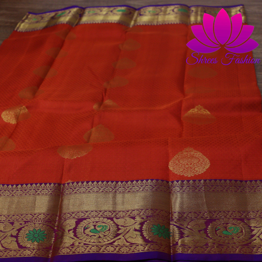 Enhance your style quotient with our mesmerizing Pure Silk Saree in Orange with a Violet pallu. Explore our collection of online silk sarees now and redefine your fashion statement. Visit our website and discover the beauty and grace that Shrees Fashion brings to your wardrobe.