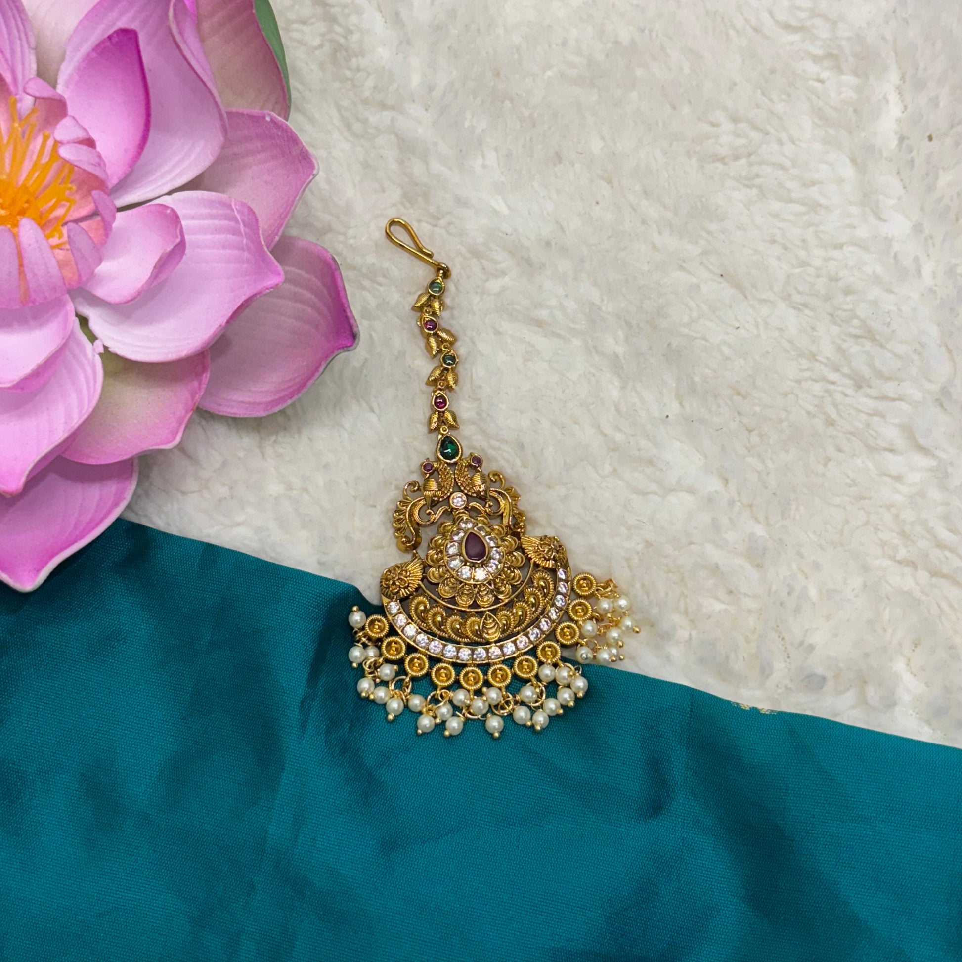 Matte Gold Finish Peacock Design Tikka – Timeless Traditional CharmMatte Gold finish Tikka