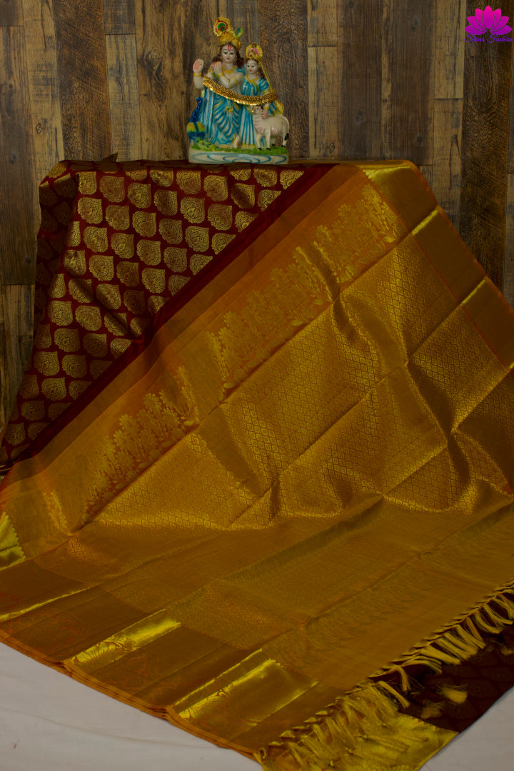 Marron and Mustard Yellow Colour Silk Saree | Kanchipuram Silk | Silk Mark India Certified