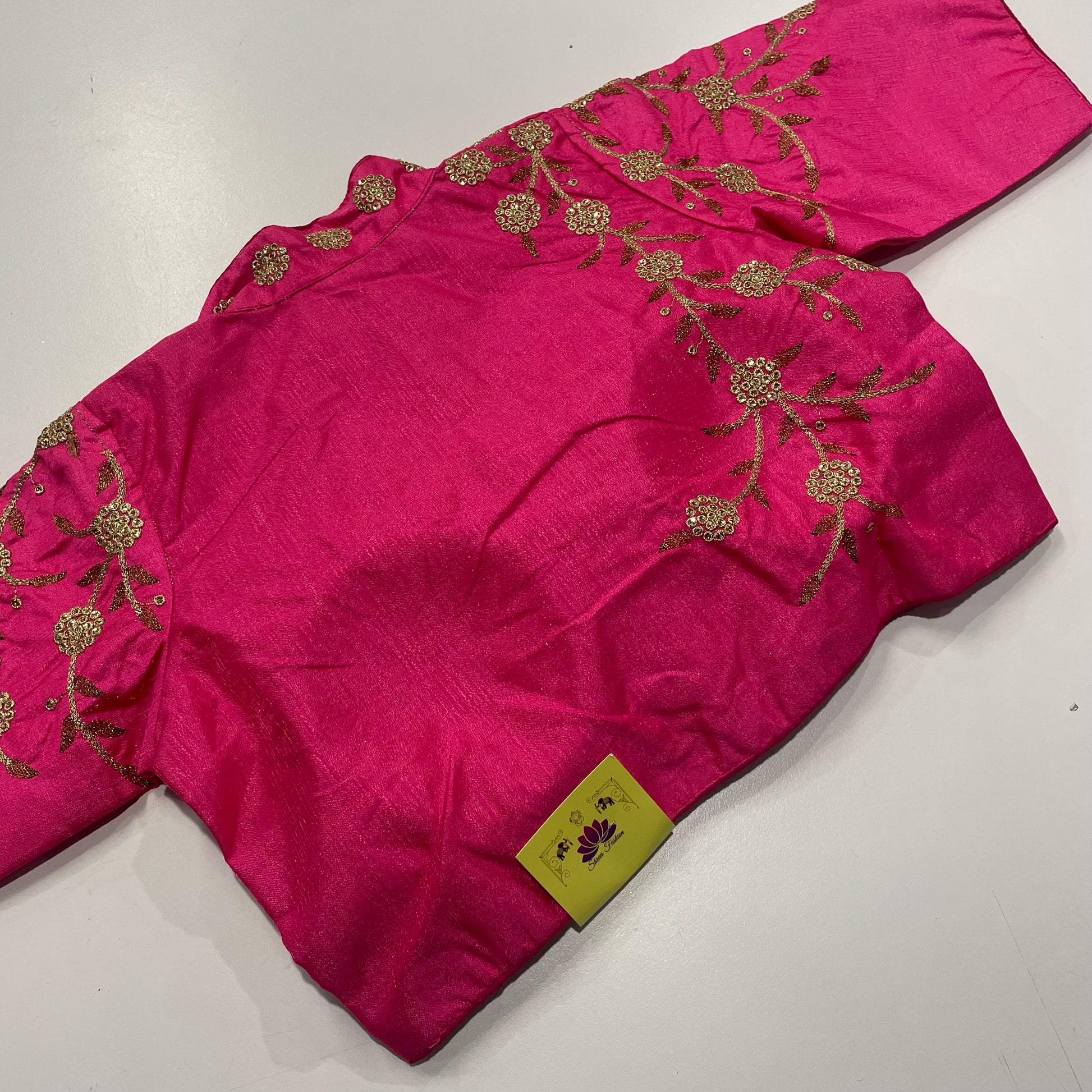 Rani Pink Collar Neck Ready-Made Blouse with Gold Embroidery – Graceful Fusion for Sarees & Festive Wear