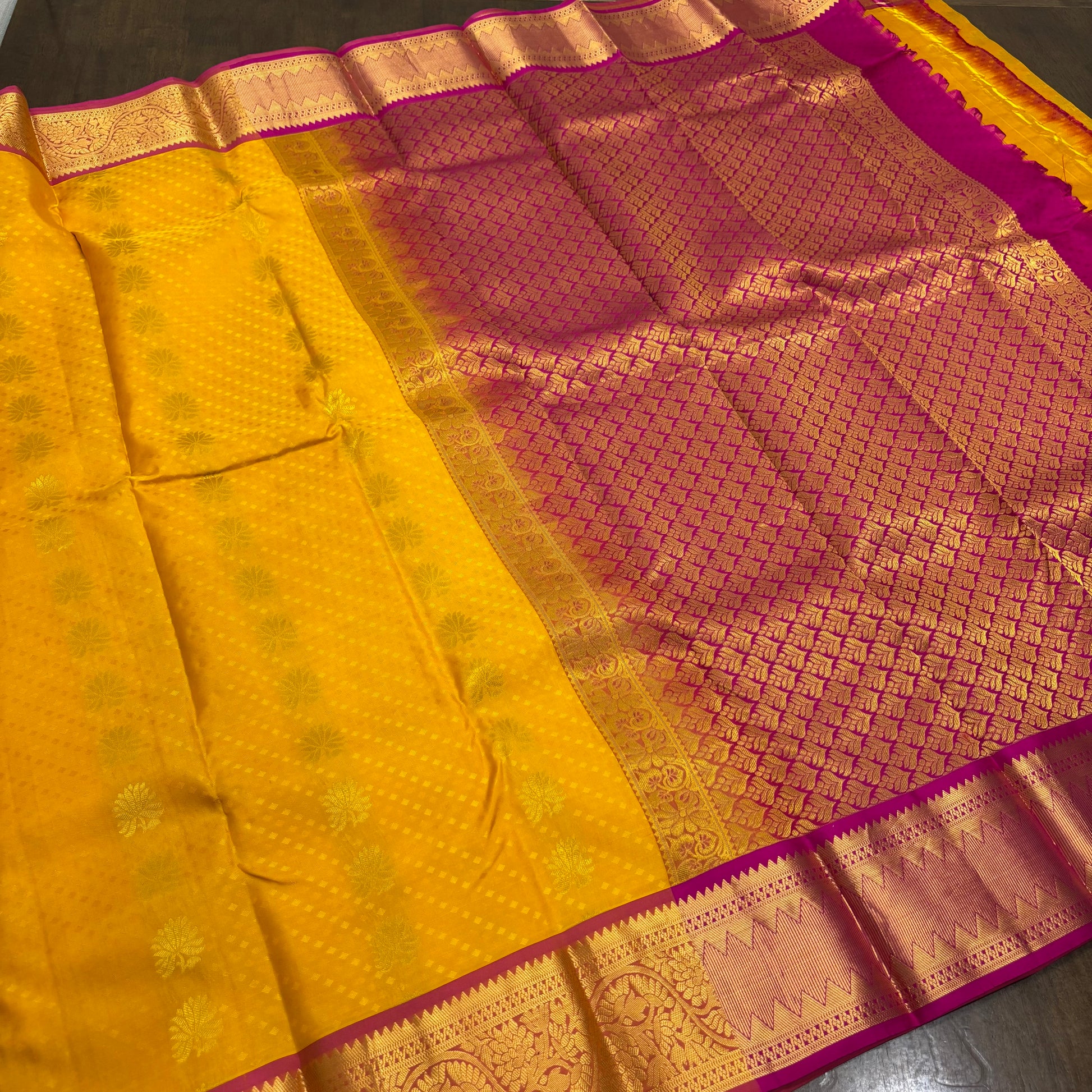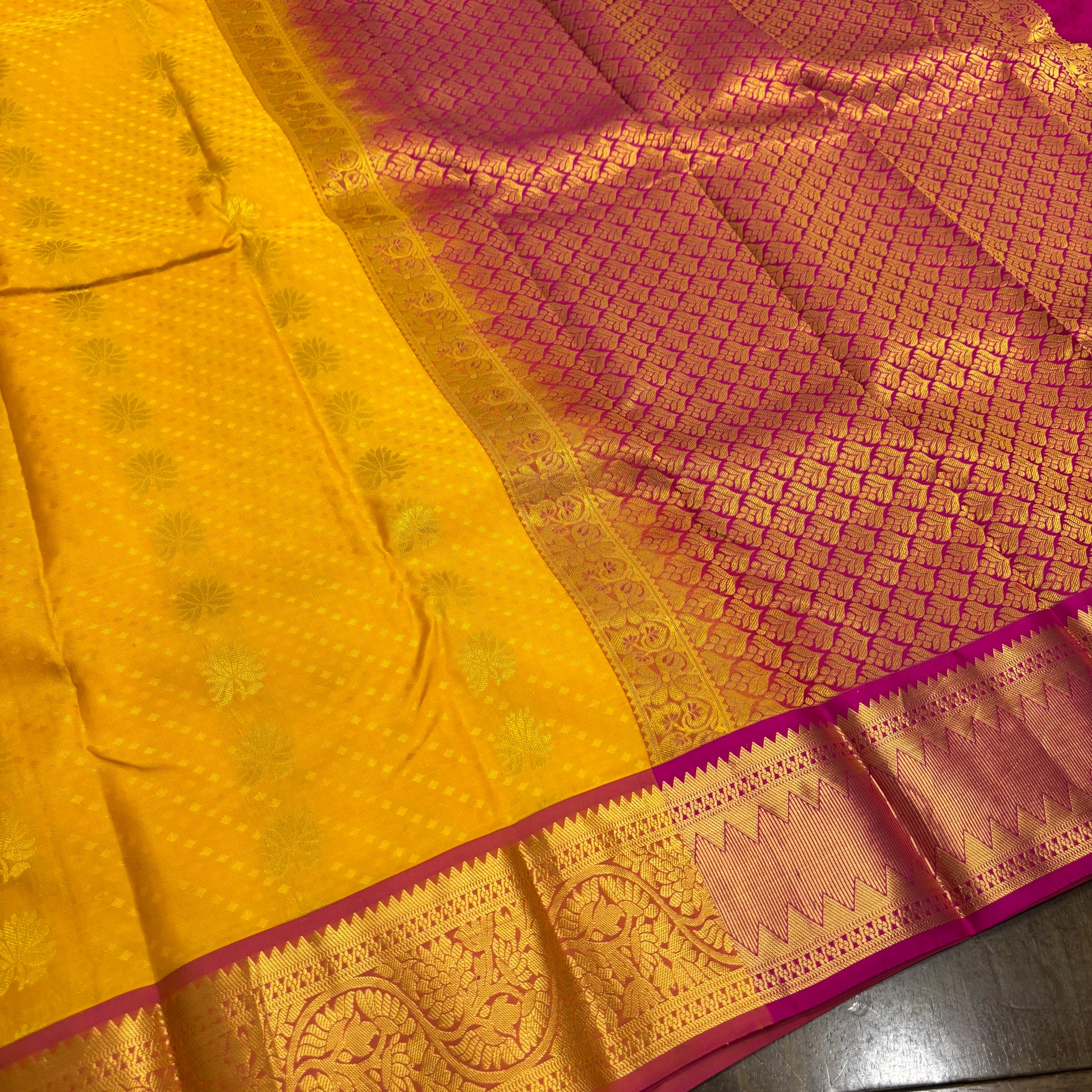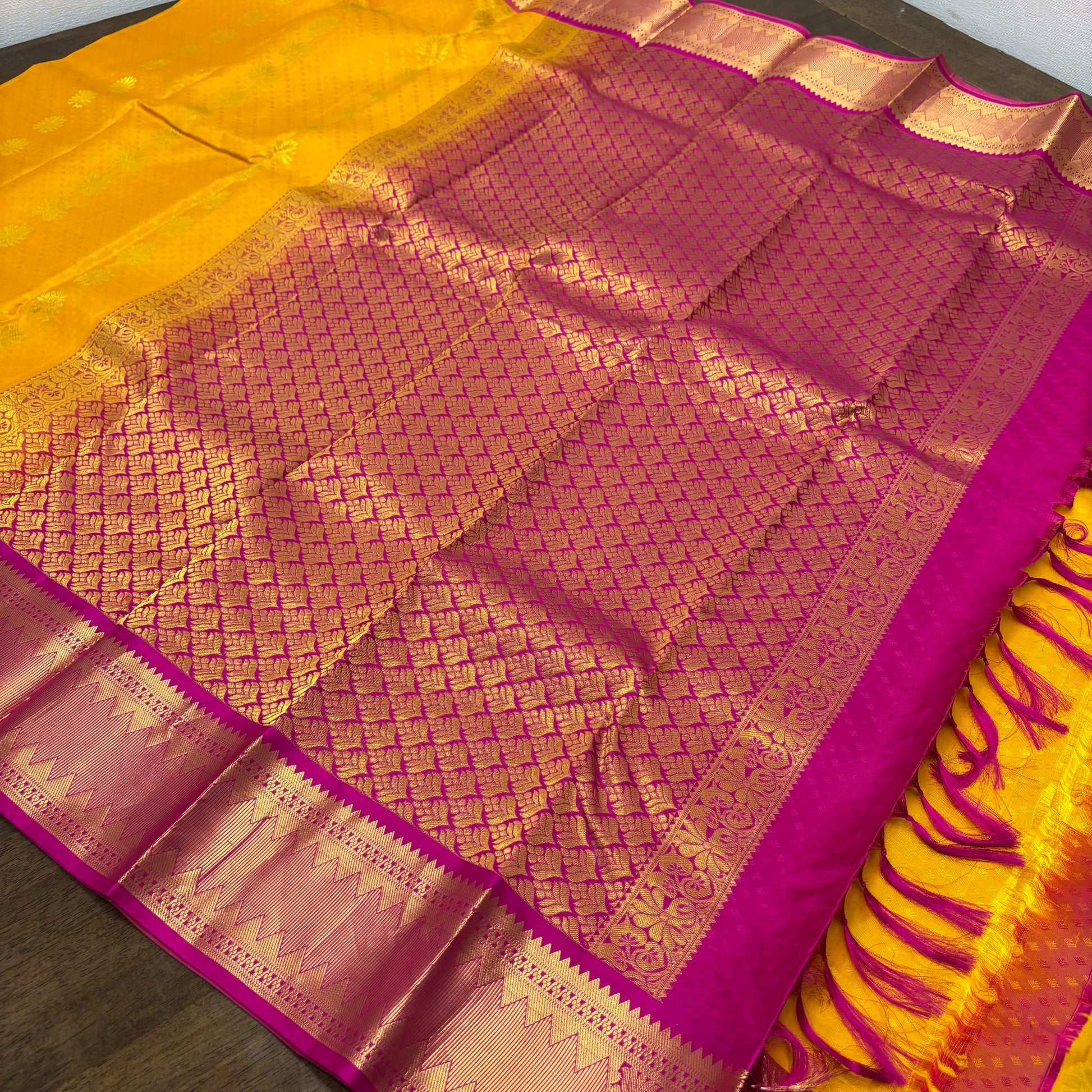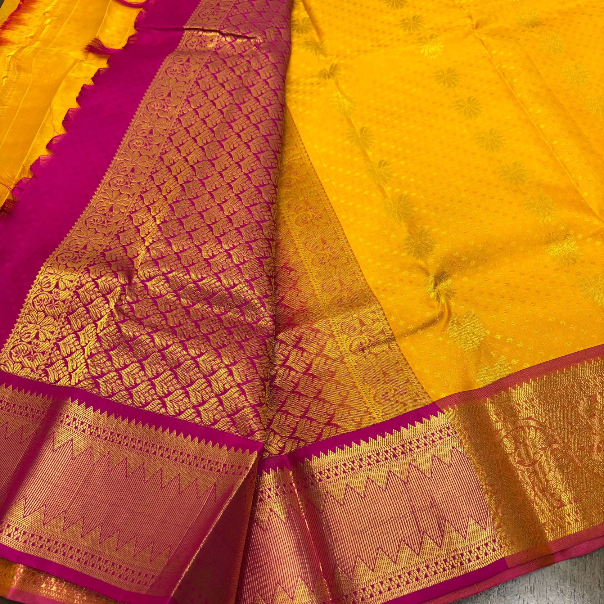 Vibrant Yellow and Pink Kanchipuram Silk Saree