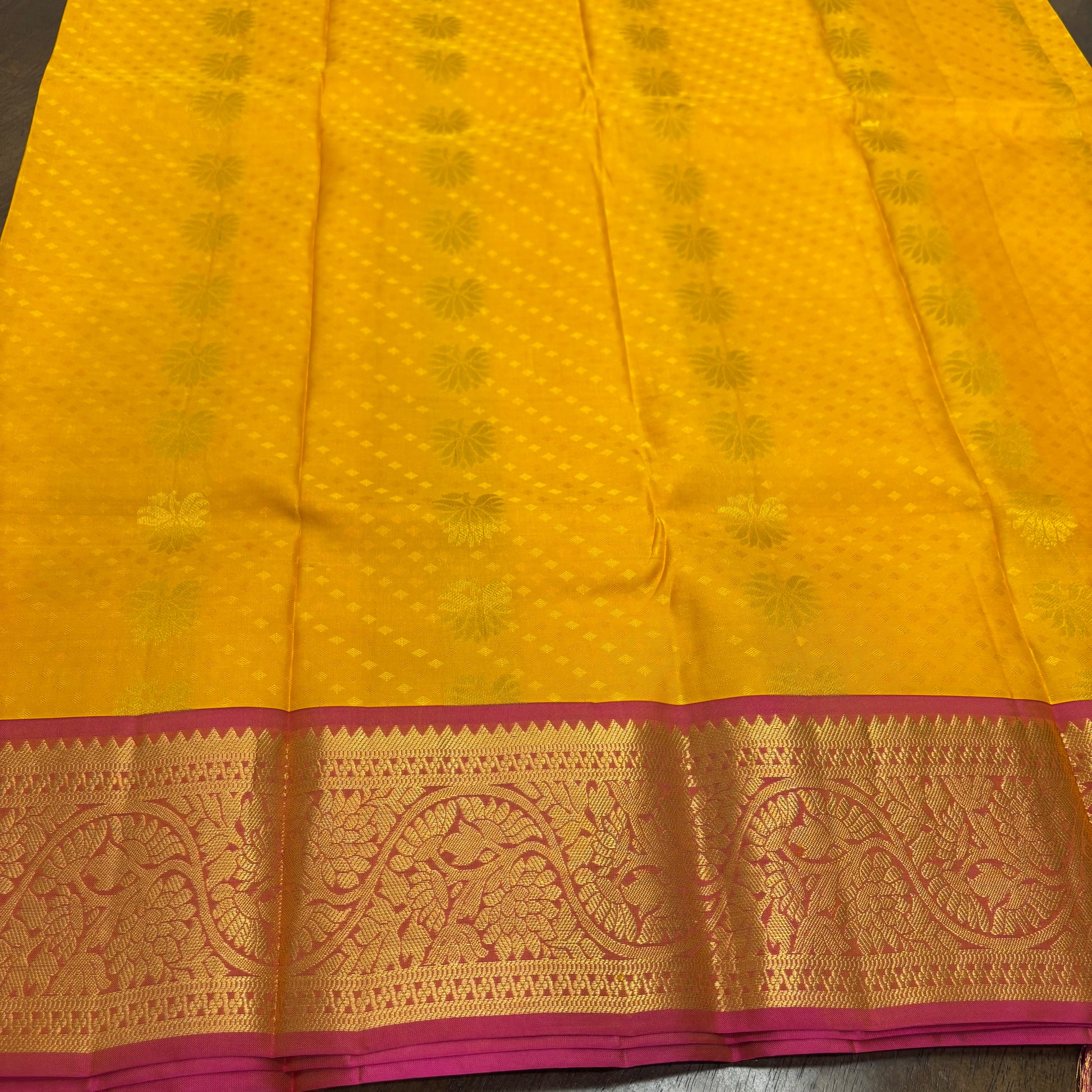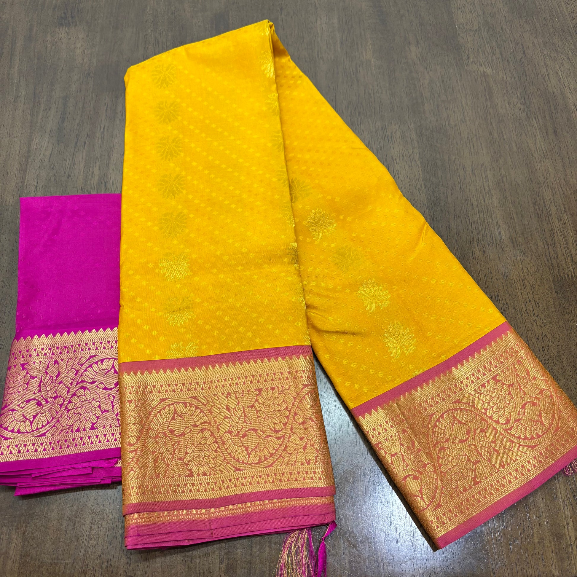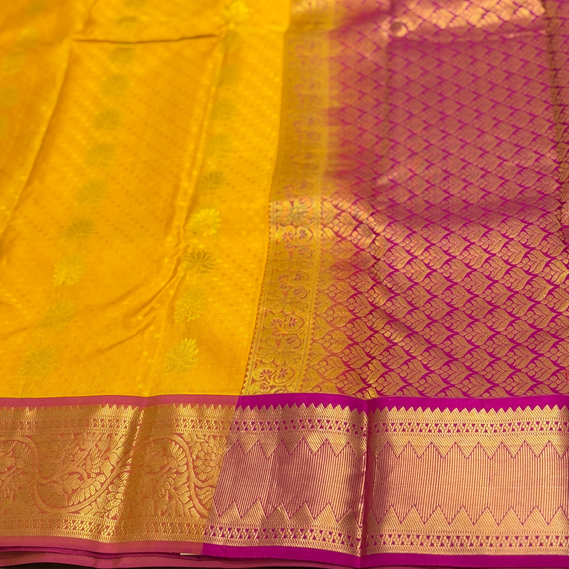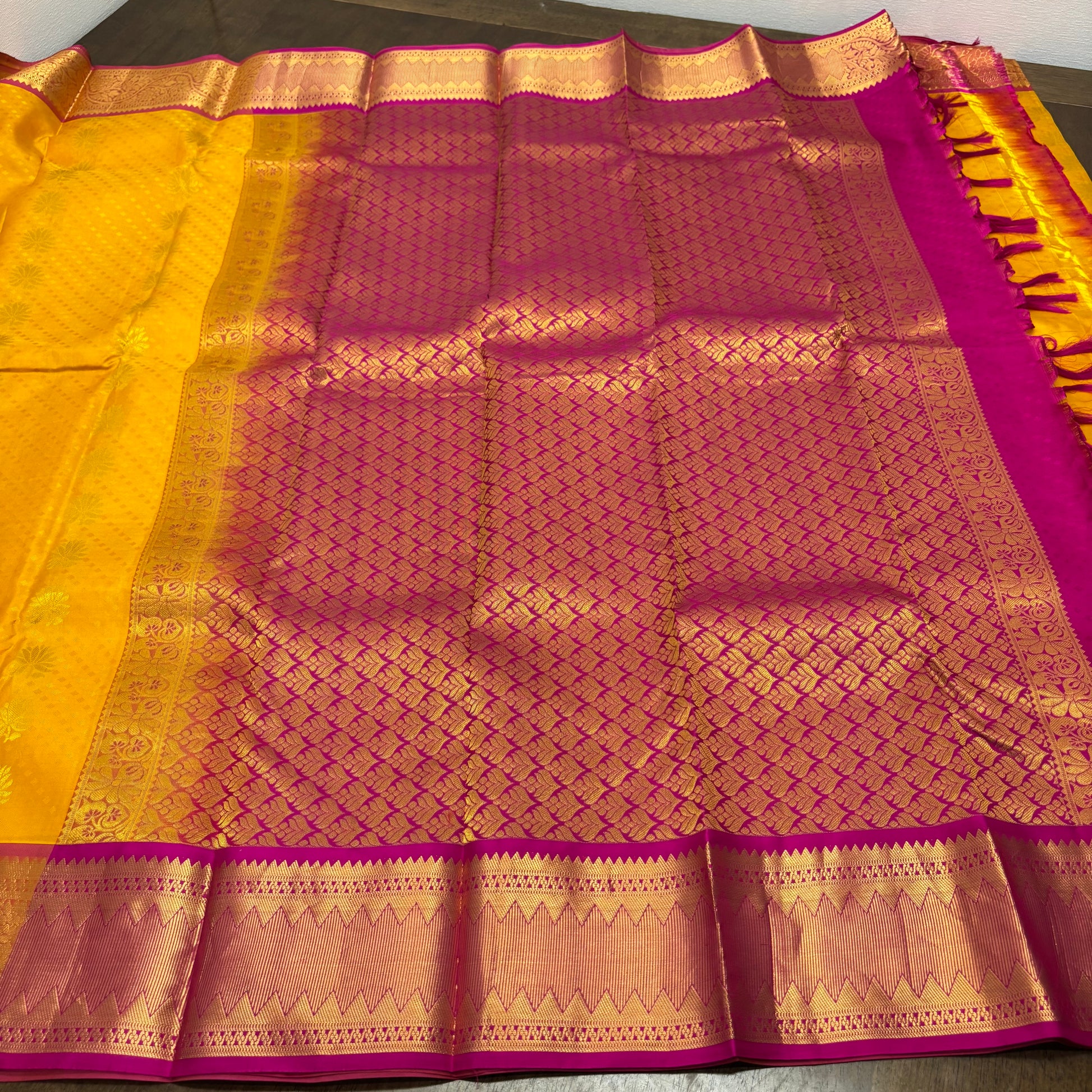 Vibrant Yellow and Pink Kanchipuram Silk Saree